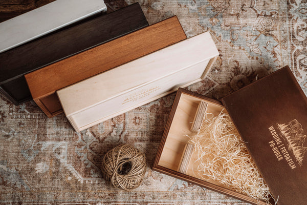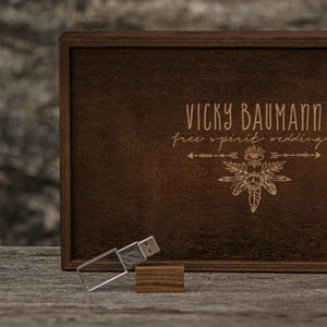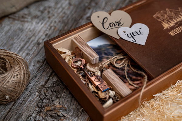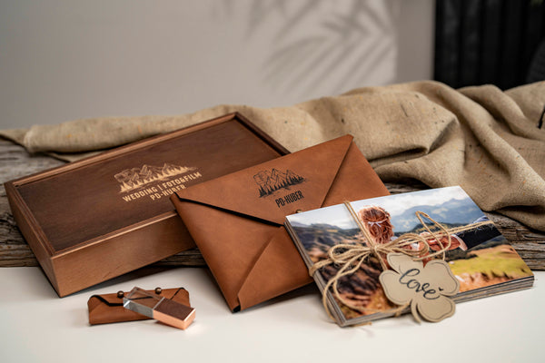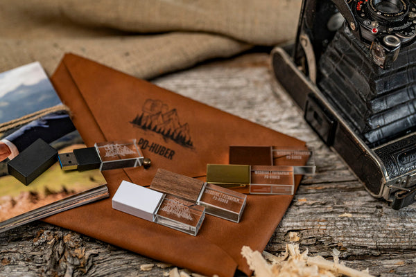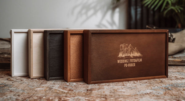 Entdecke jetzt unsere breite Palette an Produkten, die Deinen Alltag als Hochzeitsfotograf/in erleichtern! Seit vielen Jahren stehen wir Dir als verlässlicher Partner zur Seite. Gib Deinen Produkten eine persönliche Note: Veredle Deine Holzboxen zum Beispiel mit einer individuellen Gravur und mache sie einzigartig. Darüber hinaus bieten wir USB-Sticks aus Holz und Glas in verschiedenen Farben, Formen und Speichergrößen, sowie Kuverts an, die Du ebenfalls ganz nach deinen Vorstellungen gravieren lassen kannst.
