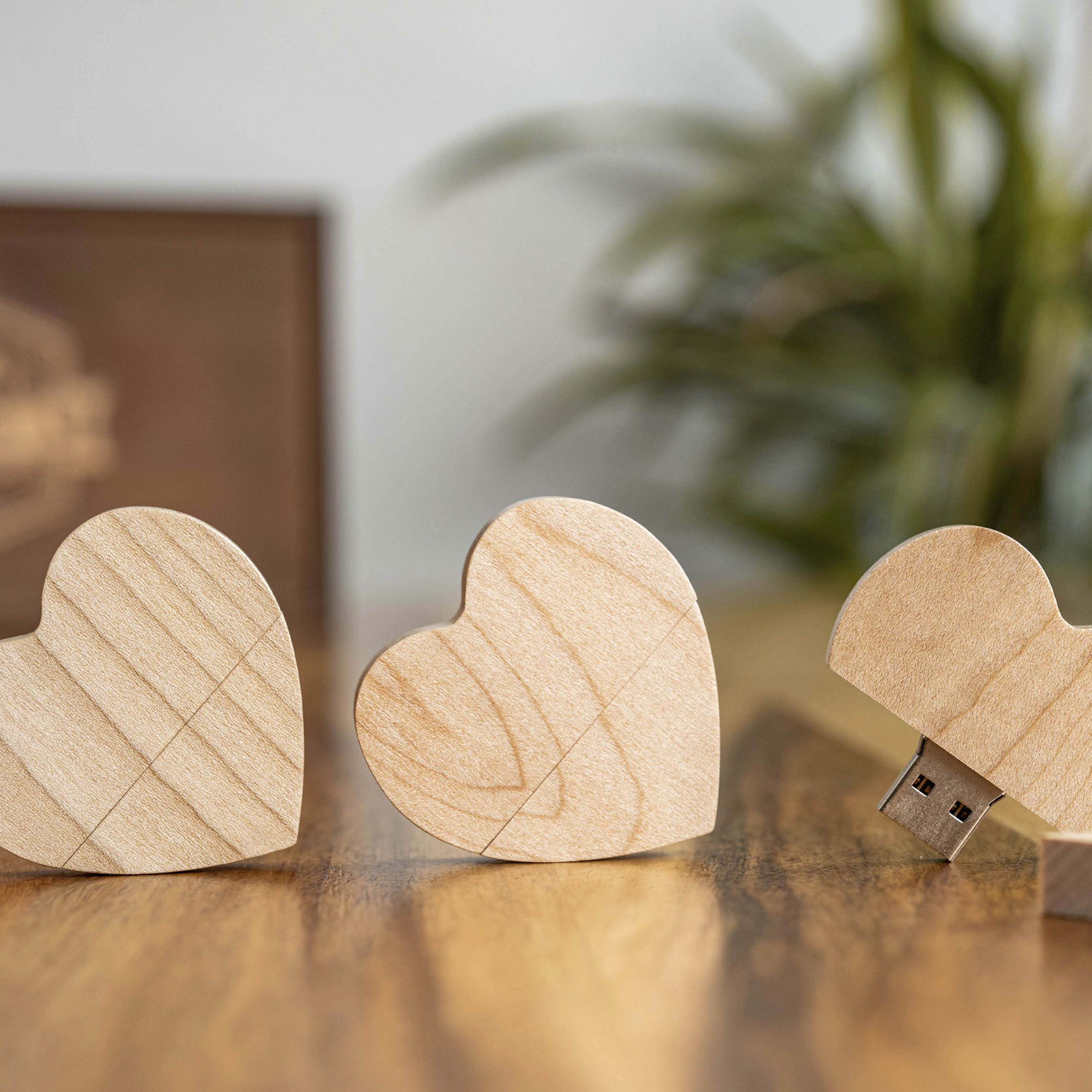 This heart-shaped wooden USB stick "Maple" is not only practical but also a real eye-catcher. With 16 GB of storage, it offers plenty of space for photos, videos, or personal messages. It pairs perfectly with our wooden gift boxes and is the ideal highlight for special occasions.